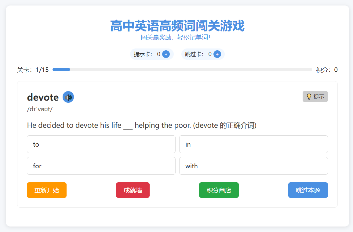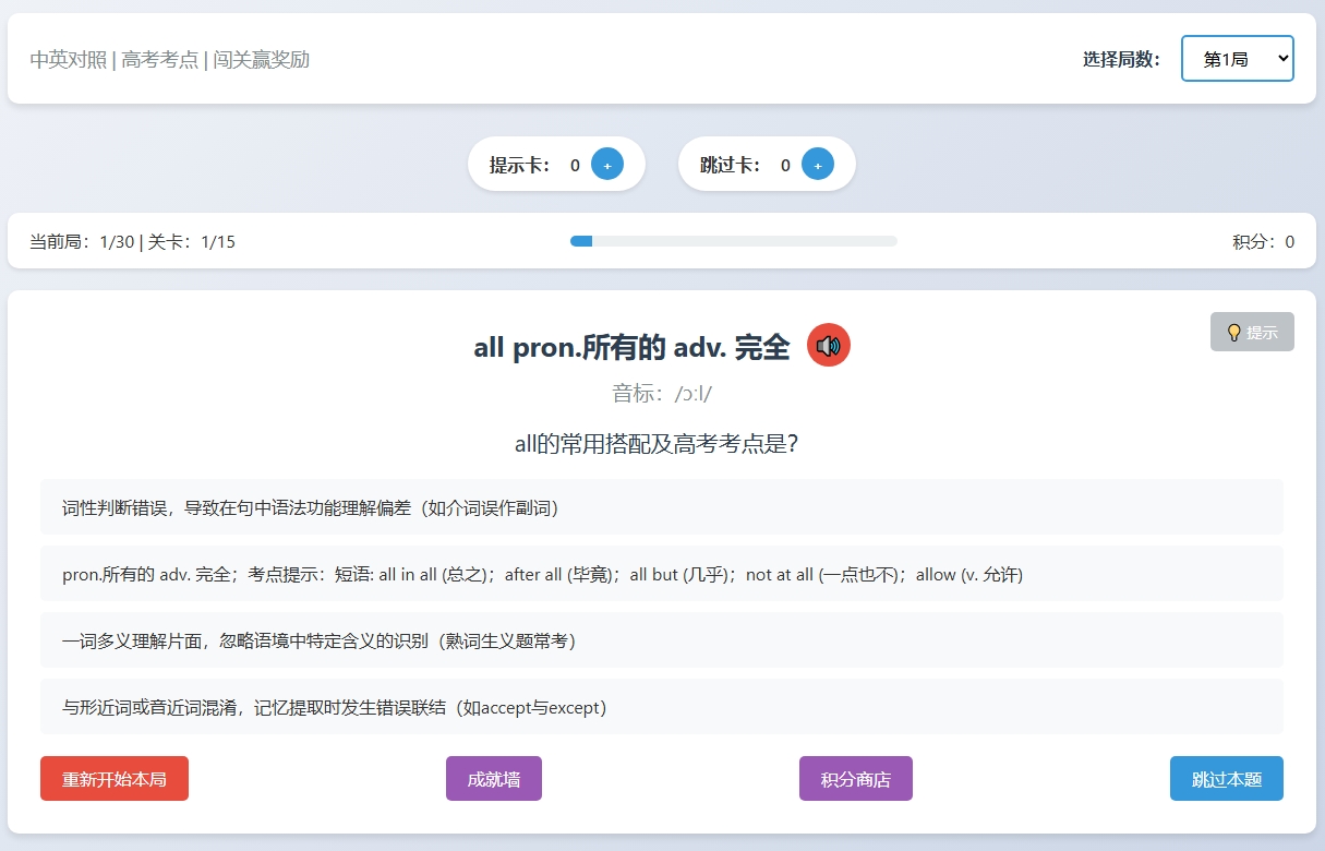 根据网络资源——高考大纲词3931个(正序版)制作的通关小游戏,利用豆包、kimi等大模型对数据反复校对后制作 […]